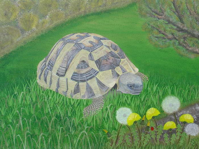 Die griechische Landschildkröte meines Neffen (der bald 18 wird). Sie hört auf den klangvollen Namen "Tornado" und deshalb habe ich auch das Bild so genannt (wird ein Geburtstagsgeschenk).