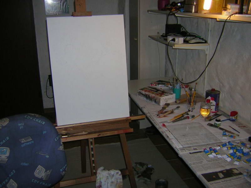 Leider steht mir nur ein Kellerraum zum Malen zur Verfügung, wobei man sich bei Kunstlicht sehr schwer mit der Farbengestaltung bzw. Farbenmischung tut.