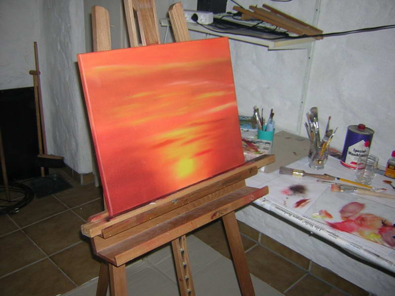 Als Hobbymaler und absolutes Greenhorn ohne weitere Vorkenntnisse und Ausbildung, ...hab ich einfach angefangen zu malen. Ich dachte mir... man könnte doch mal was ganz anderes machen, als ständig am Rechner zu hocken..., einmal etwas ohne Silizium (Rechner) und ohne elektrischen Strom. ... mal was ganz Anderes!!! Im Jahre 2008 bekam ich zu meinem Geburtstag eine Staffelei (... weil ich schon vor Jahren so einen Gedankengang ausgesprochen hatte). Prompt bekam ich solch ein Teil beim nächsten Anlass mit dem entsprechenden Starterset (also Leinewände, Farben sowie Pinselset) geschenkt.