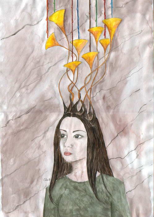 Öl auf Leinwand Zur Erklärung des Motivs: als ich noch ein Kind war, wohnte ich mit meiner Familie auf sehr beengtem Raum und war so gut wie nie für mich allein, hatte sozusagen kein Rückzugsgebiet. Deshalb stellte ich mir in meiner Phantasie eine Art eigenes Zimmer in meinem eigenen Kopf vor. Mit Schaukelstuhl, Büchern einer Truhe voll mit meinen Gedanken und meinen Augen als Fenster nach draussen. Diese Vorstellung gefiel mir damals sehr gut, war mir sehr wichtig und für mich ist es heute eine Art Zeitreise, das zu malen. Deshalb heißt das Bild " Inside my brain". |